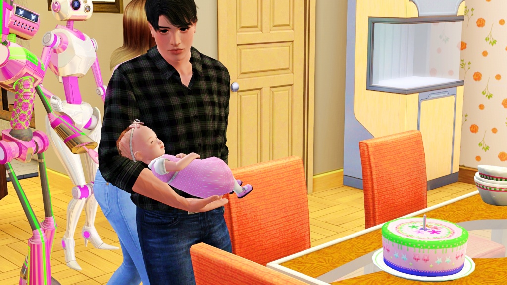 Jessica Crane’s birthday finally arrived. Robin and Ann would celebrate in private, with no guests except for Robin’s plumbots, Bethany, Five, and his new creation, Prototype 005. Ann lit the candle on the birthday cake, and Robin held Jessi in his arms to help her blow it out, while the three plumbots came over to cheer her on. ‘Cheer’ is just a figure of speech, because Ann didn’t exactly feel cheerful. All along that day she had been worried about Robin’s distant and evasive attitude. He had been strangely quiet, as if his mind was somewhere else. That somewhere was the anguish of having to hurt Ann by asking for a divorce, and the knowledge that Jessi’s birthday party was the deadline, the realization that the moment of truth had arrived.