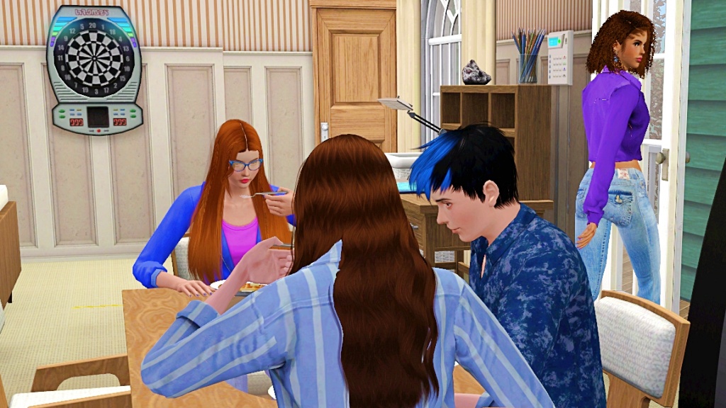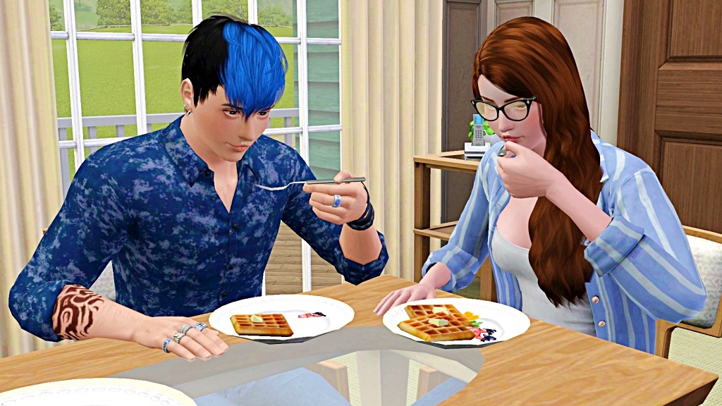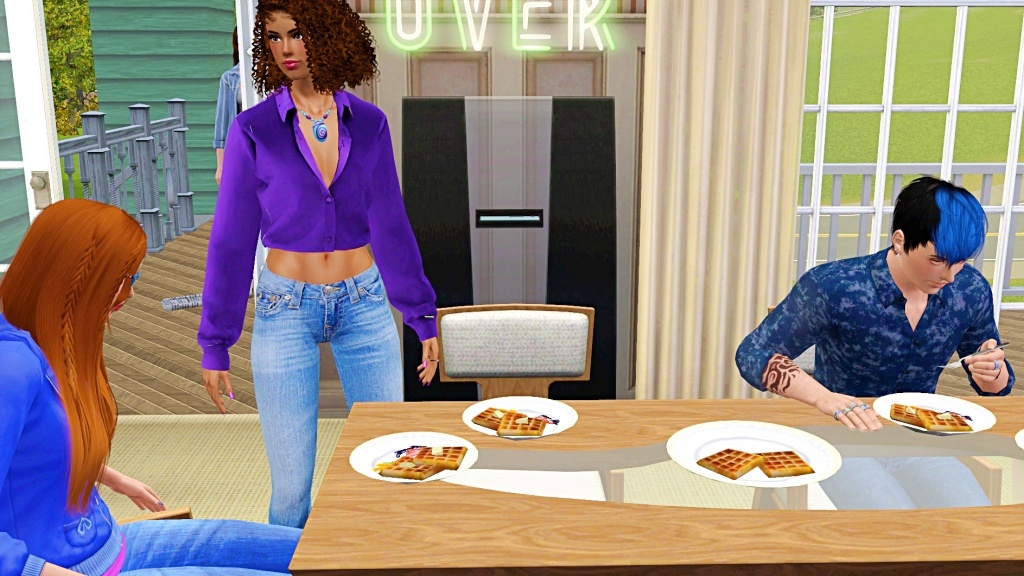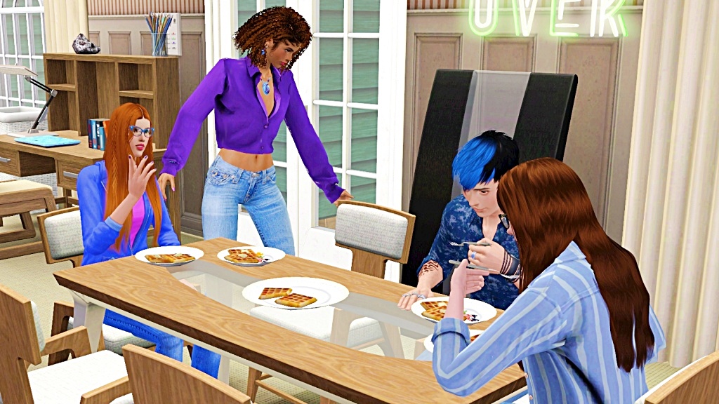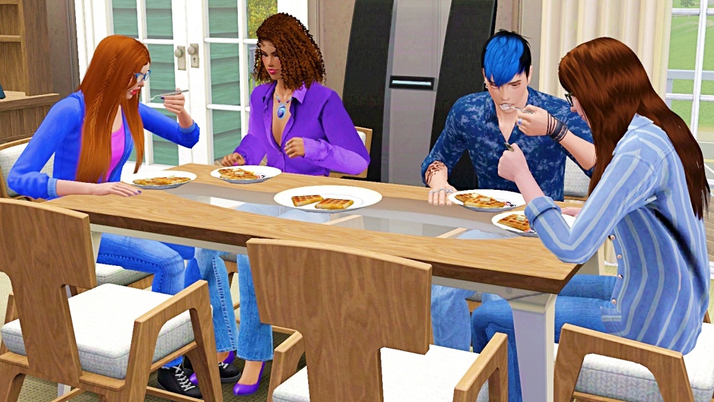It’s breakfast time in the dorm, Sarah called Lauri, she’s on her way over. Dale made waffles for everyone, for which the girls are grateful, since none of them were gifted with the cooking skills.