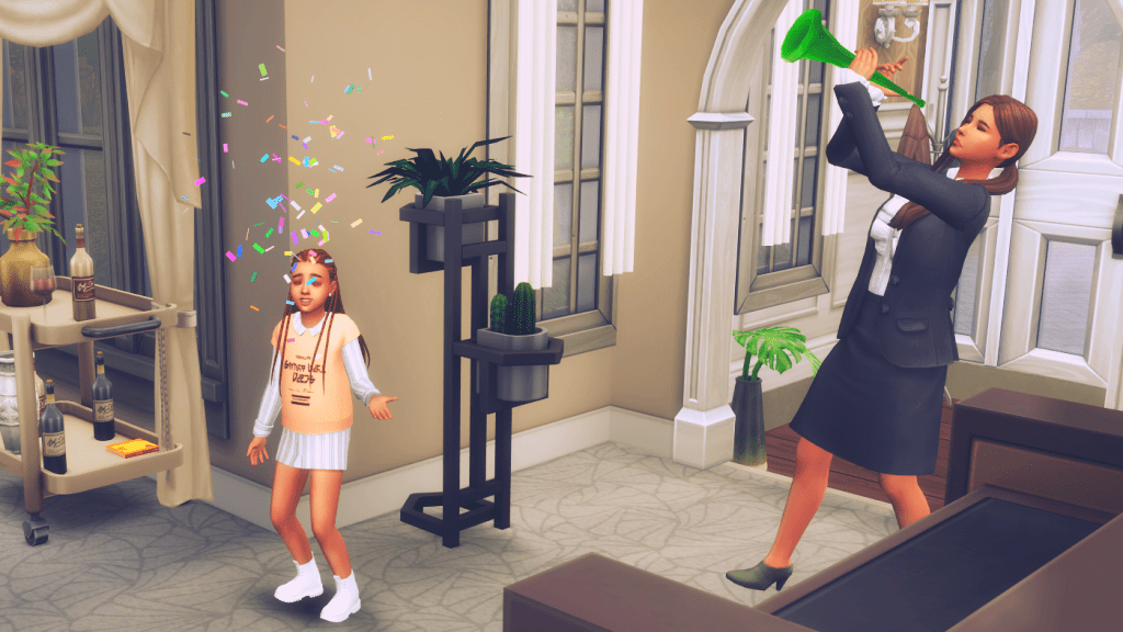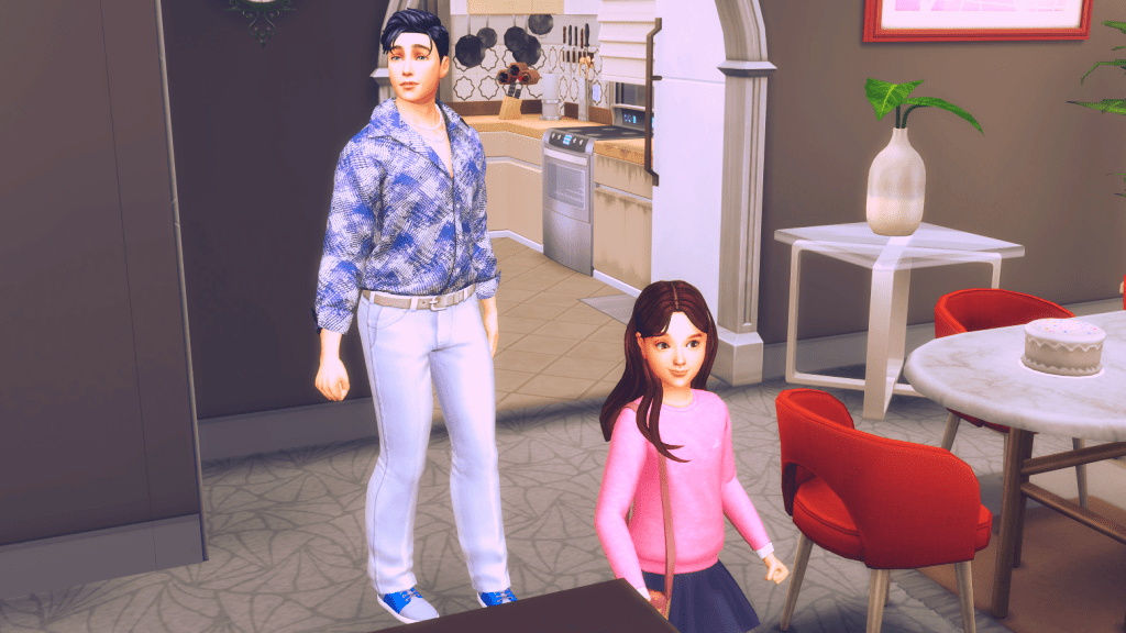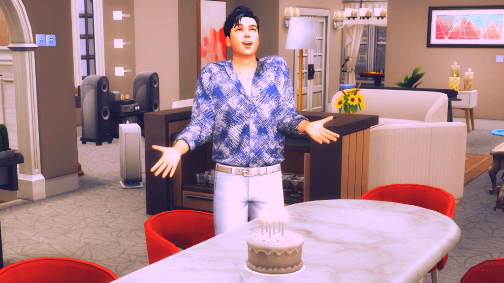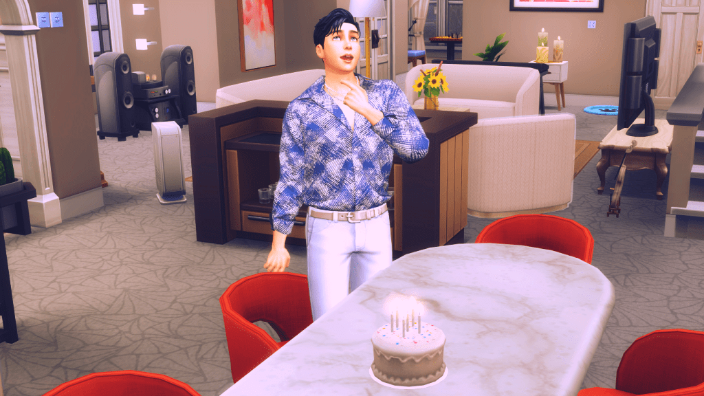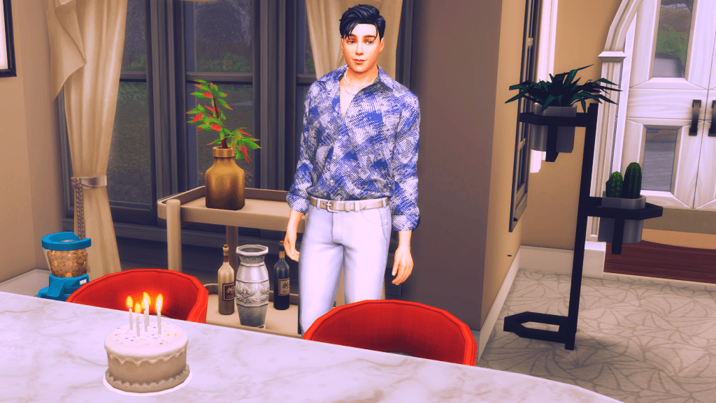 Here’s a second take on Allan’s birthday, because you know Sims, sometimes something goes wrong with birthdays. I don’t remember what happened, or why I decided to repeat it, but it really wasn’t much different from the first time. Allan is wearing the same clothes, but this time the cake was white, Allan actually became an adult at the end, and Zoe agreed to come down to party with him, as did Anika and Kennedy. Phew!