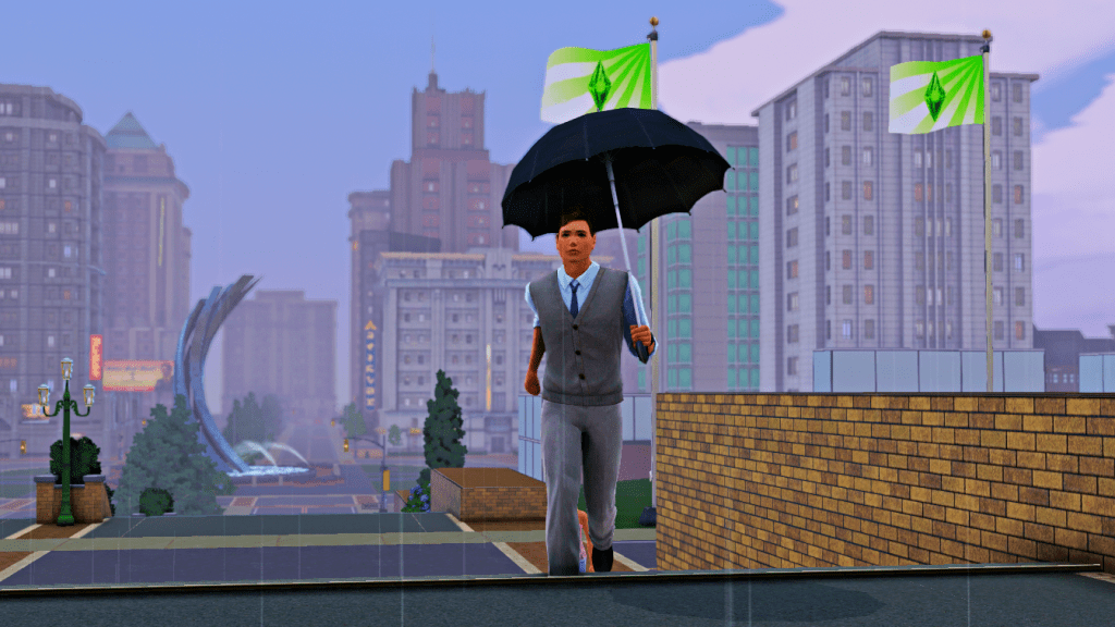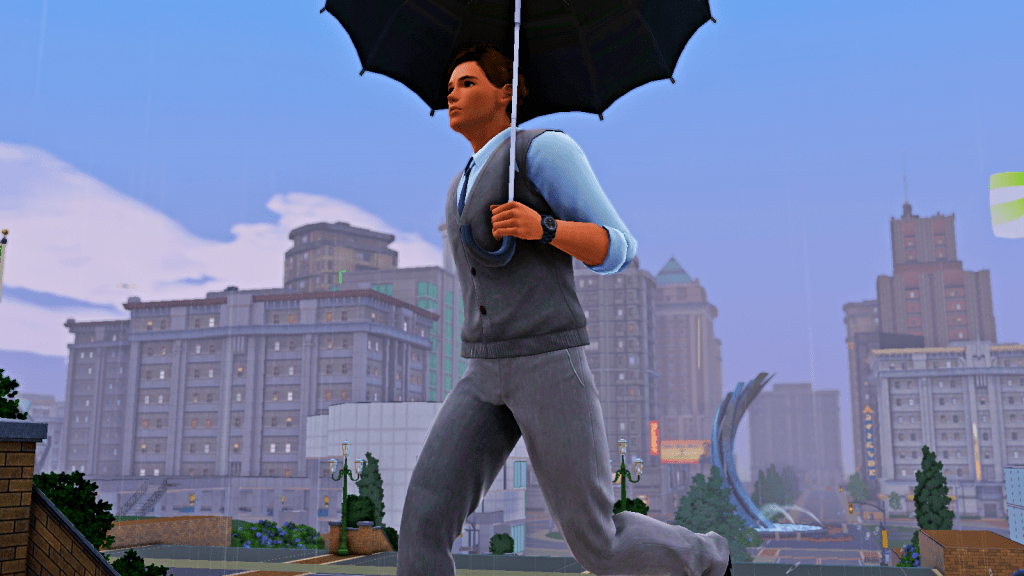 Suddenly Patrick remembers he’s carrying his umbrella.