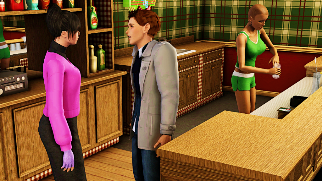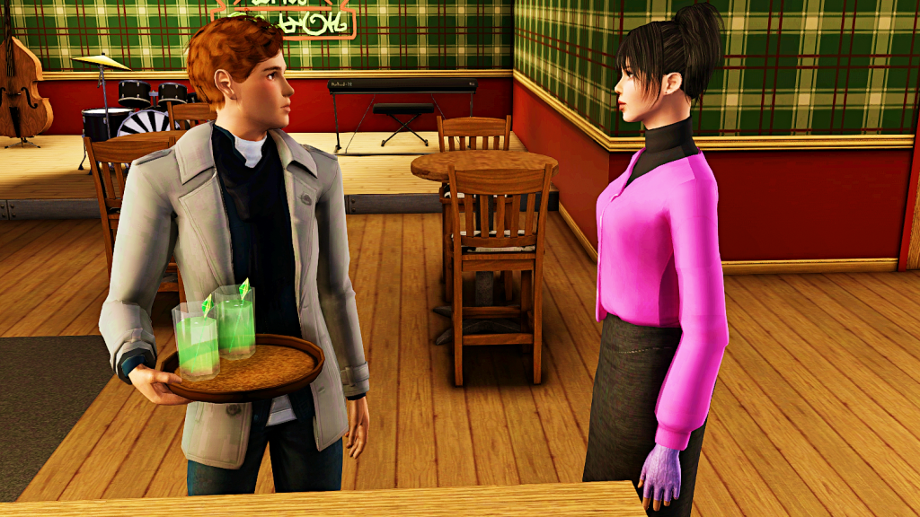 They start the night with this nice plumbob shaker drink, I’m not sure of the name, I think it’s a a sorrow annihilator named Winning Streak. Interesting choice for a romantic first date, but whatever.