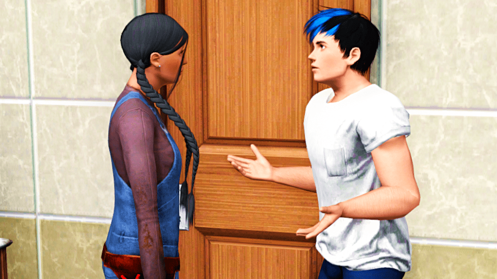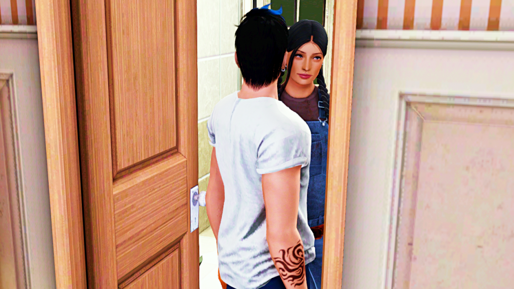 After a few more seconds of hesitate, he musters up his courage and goes to open the bathroom door. The ‘burglar’ turns out to be this girl in braids and overall.