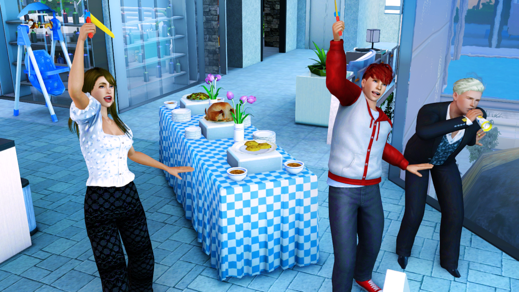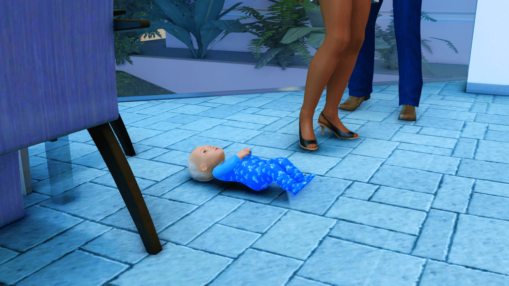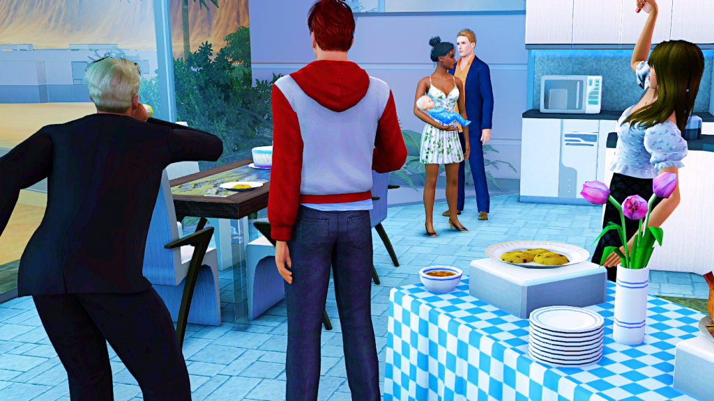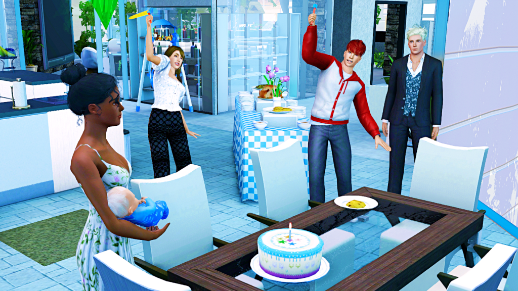 The party has begun! Deanne, the babysitter, never does her job, but today she decided to monopolize Davy and take him herself to blow out the candle on the cake. Cynthia didn’t seem to mind much, but Terence wasn’t too happy. (This is one of the things that annoys me about the babysitters in this game, sometimes the parents can’t get close, this time not even on their own child’s birthday). 🙄