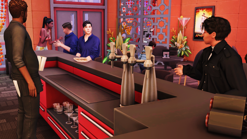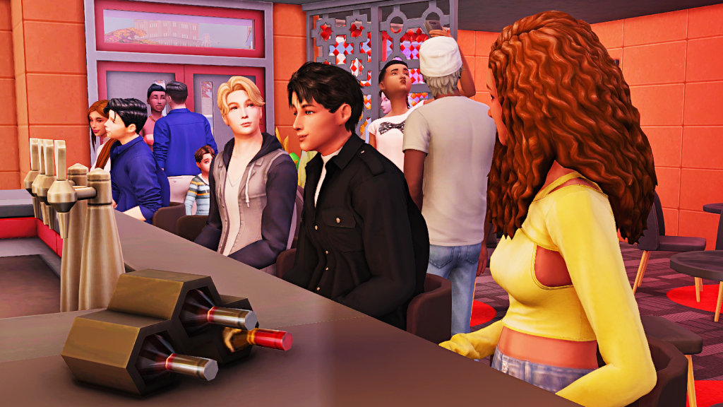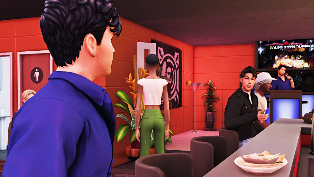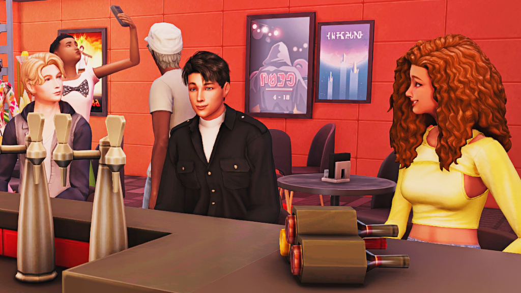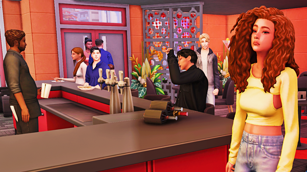 Allan: Too bad I can’t drink, I’m rehabbed. Oh, but this bar looks so good, the fake drink on the wall is such a temptation, and that picture of Bobby next to it isn’t helping either. Maybe I’m the one who should go home? Hopefully Zoe has finished talking to her friend. She was waving her goodbye a while ago, why hasn’t she left?
