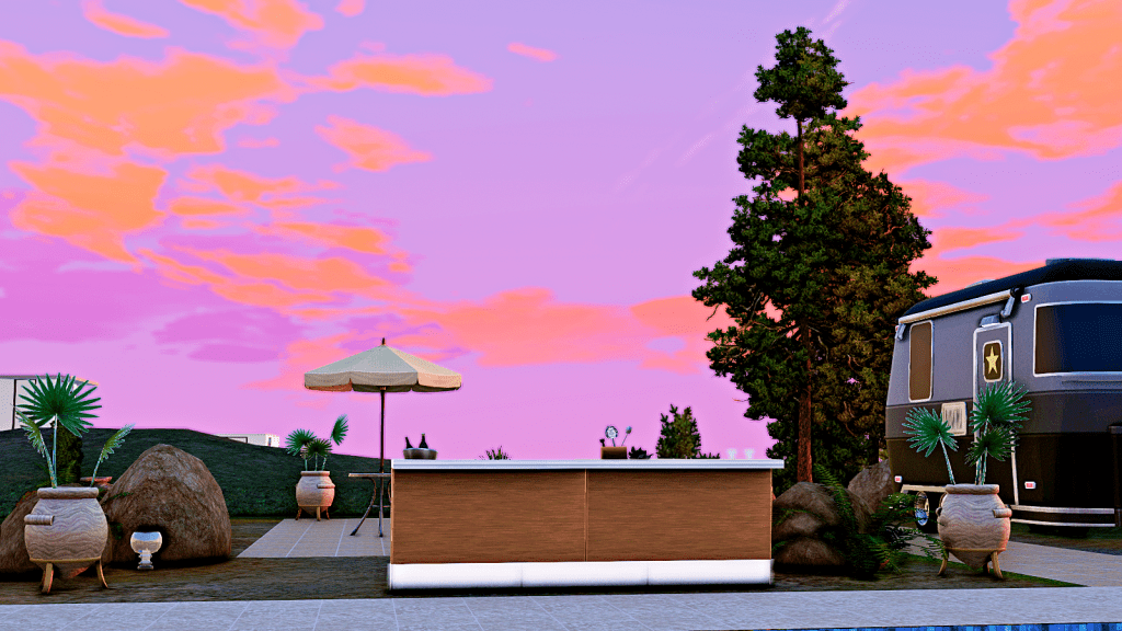 Another view of the courtyard, with the trailer house and the bar, behind which is the jacuzzi.