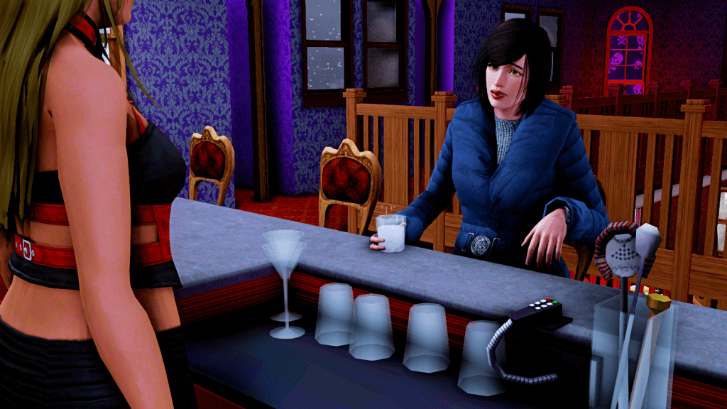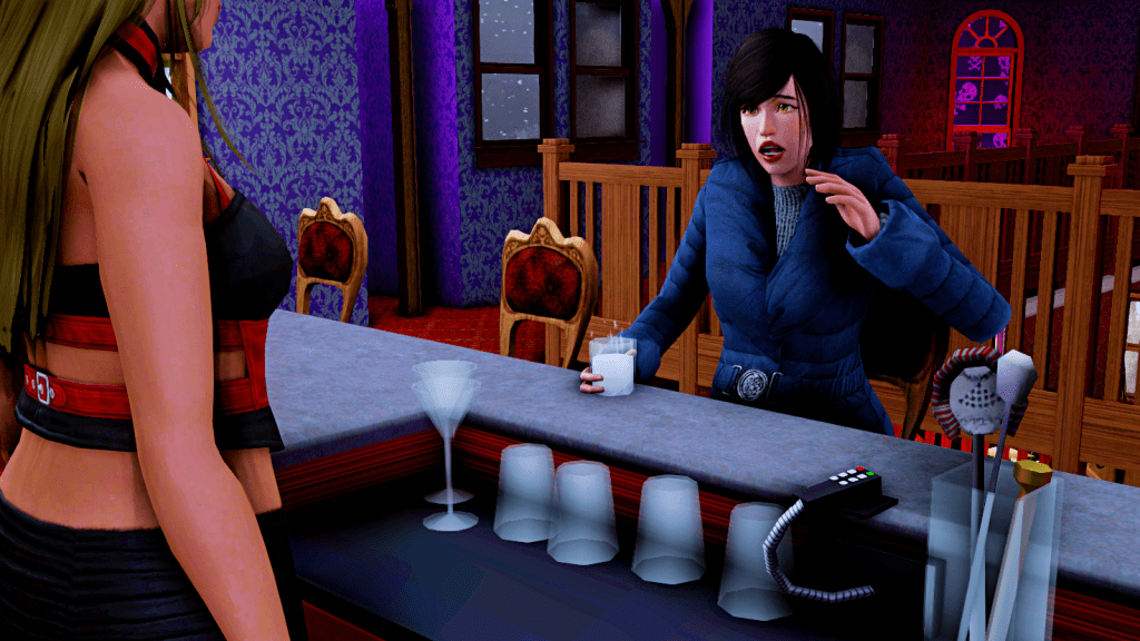 Elspeth, spilling her sorrows with the Plasma 501 bartender: She’s pregnant with Randy Kingston’s child, he asked her to move in with him, but they’re not married yet, which has her parents, Lady and Jeffrey Cook, furious. Then, on top of it all, she has to drink this horrible non-alcoholic drink.