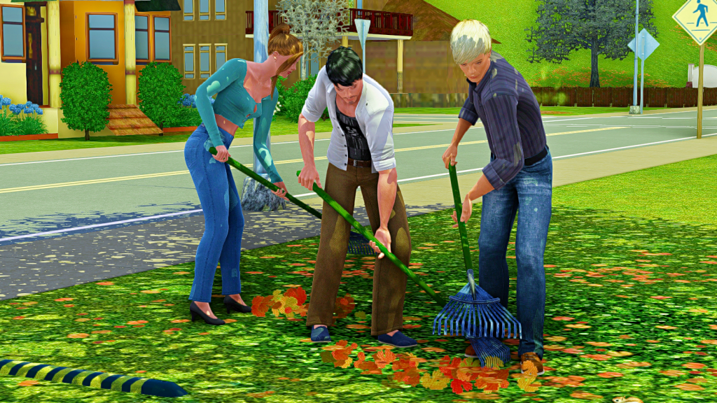 Meanwhile, Leah and Eric rake the leaves that cover the front yard, helped by Jon Lothario.