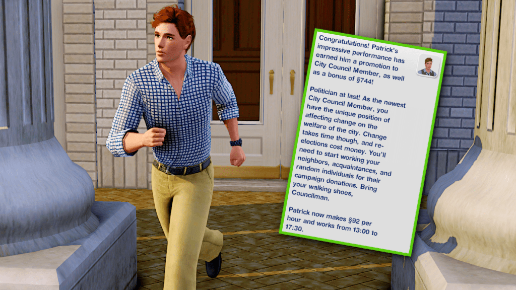 He was first promoted again, to Yes-Man, and still got an extra 8 simoleons per hour raise.