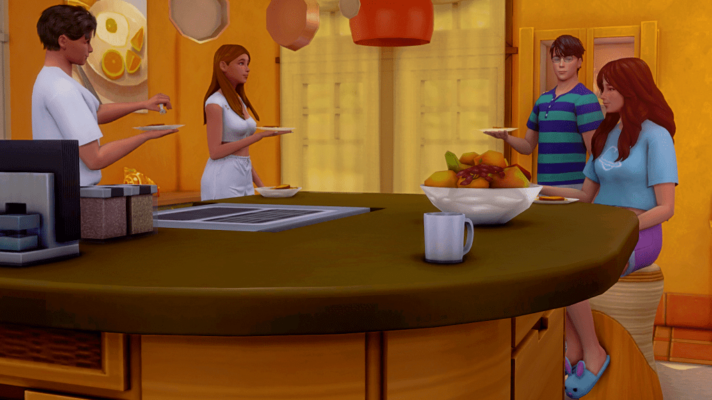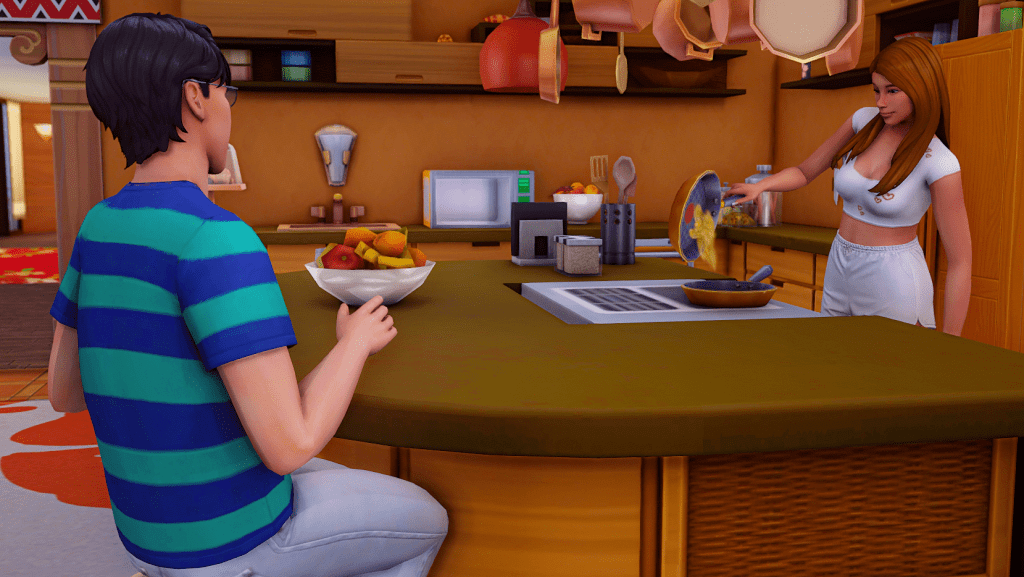 Zoe finished preparing breakfast, Alex is the first to come to the call.