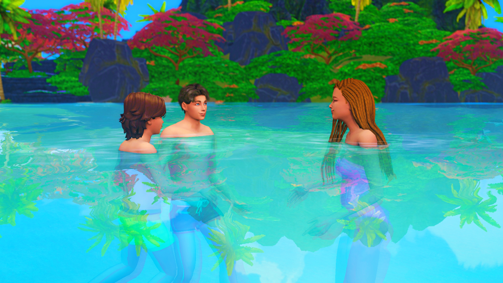 Kennedy and Zeke are still in the water; Anika left, but now Lukas has finally joined them, after applying a ton of sunblock, that is.