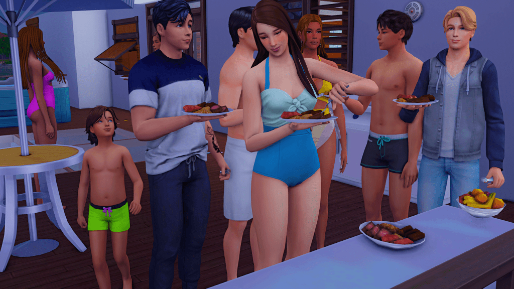 To forget her worries, Anika goes for another plate of barbecue, while Zeke makes his way to the food table.