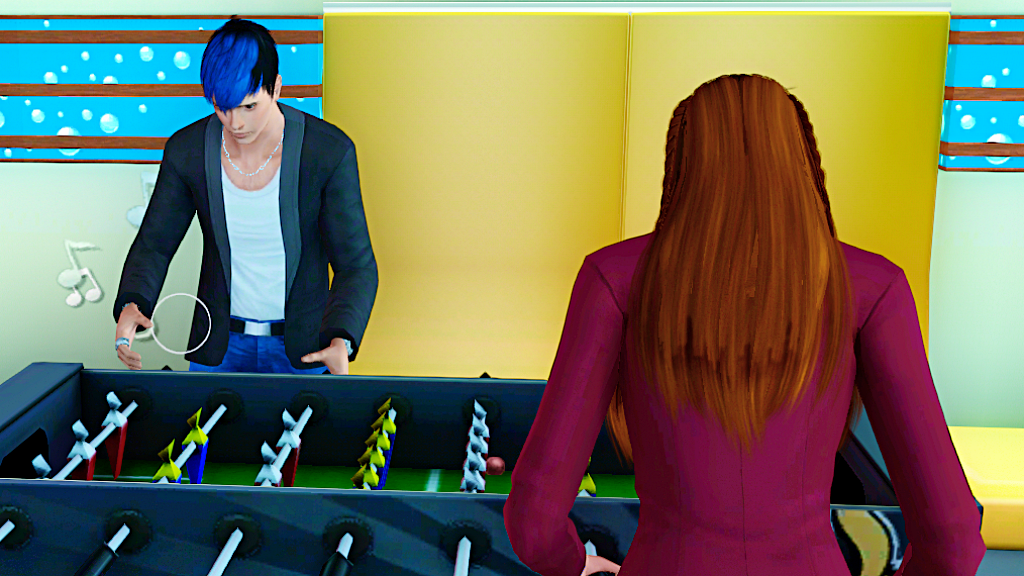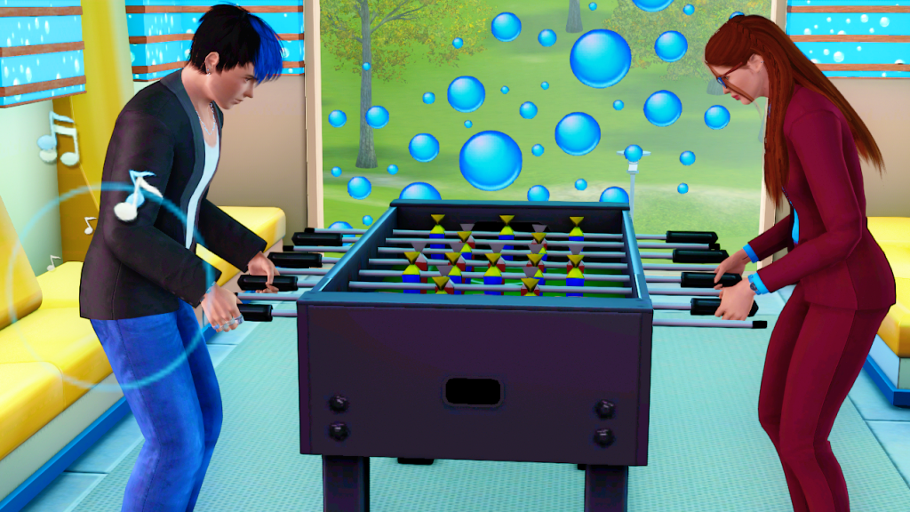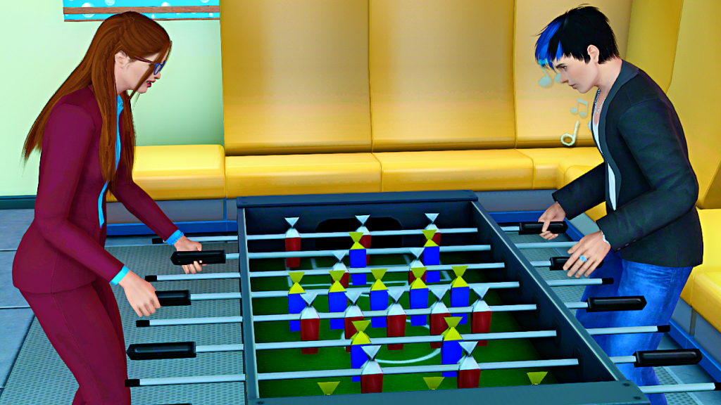 Sarah: Oh, come on, don’t you know how to play? You’re stuck at this table for life, you have no other job but to kick that stupid ball.