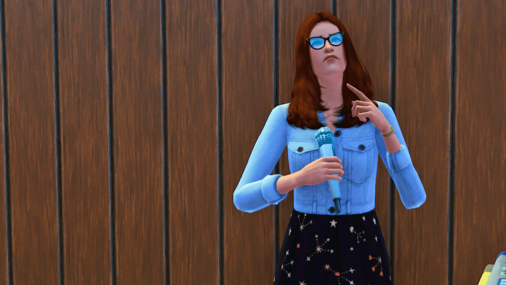 Thanks to her entertaining transmission, Lauri is now “ready for the lifestyle of fantastic conversation, becoming a socialite of renown, and always knowing the right thing to say. To become more Charismatic, Lauri will constantly need to get out and socialize with sims in the neighborhood”.