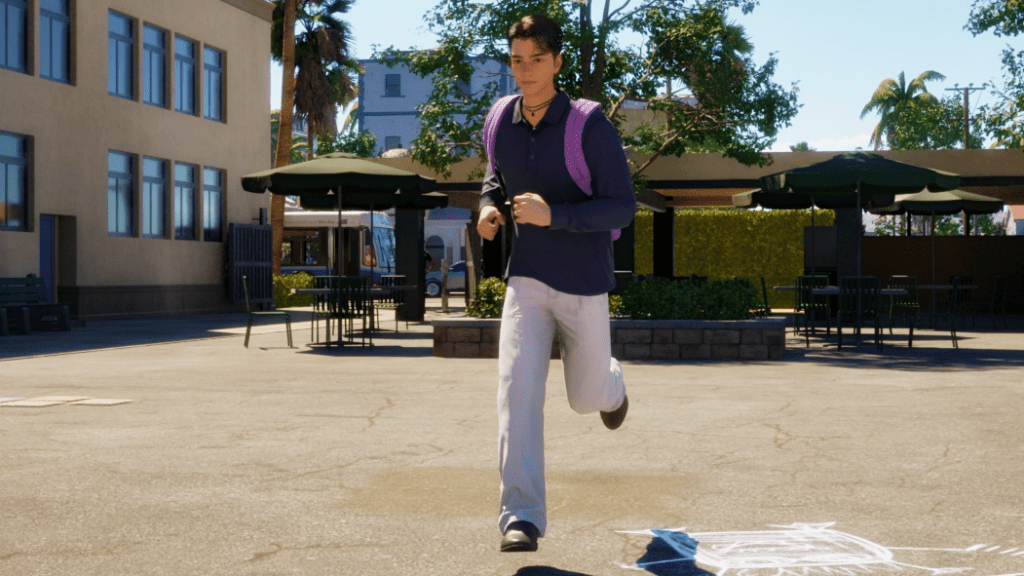 Arriving at school. He had to run because after his talk with Lucia he was running a bit late.