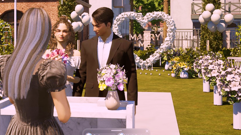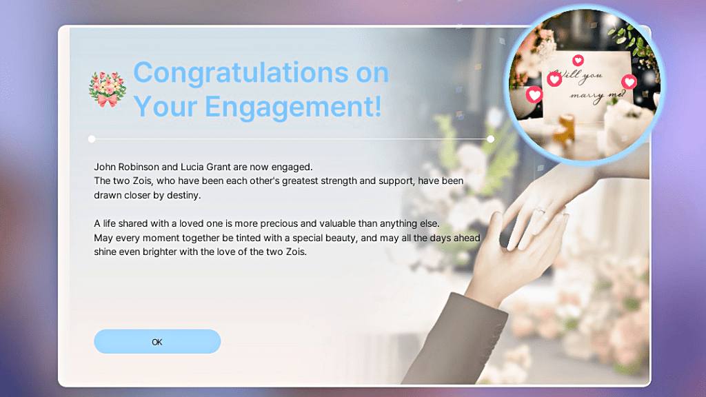 This is a screenshot of the in-game proposal, hearts and all, including the icons or “plumboLucia said yes to marry John.bs”.