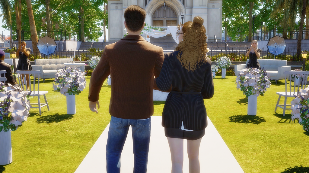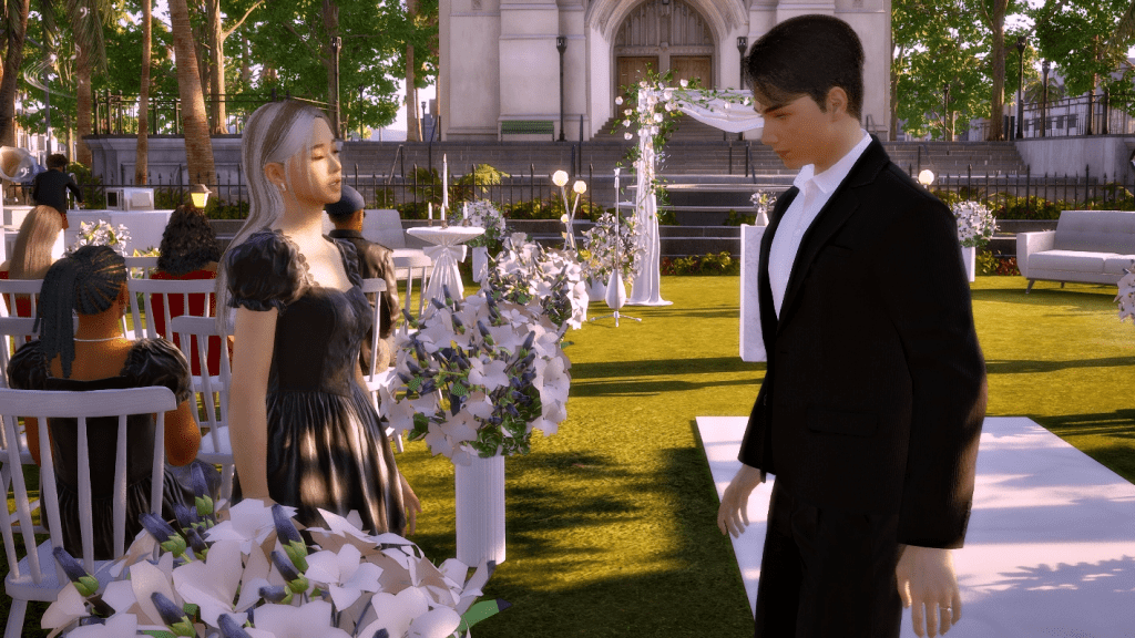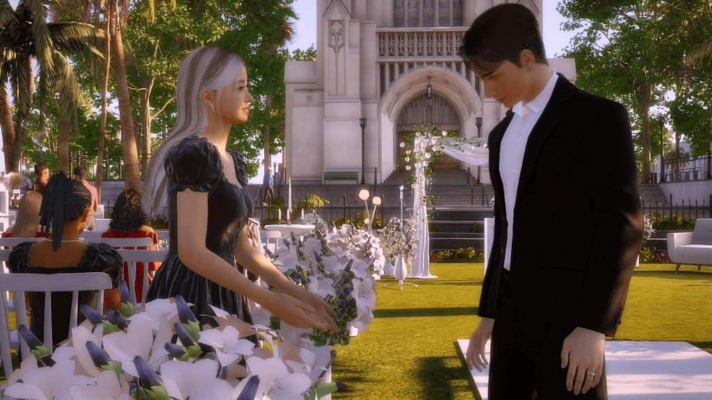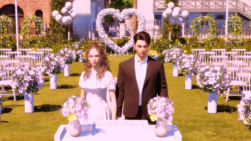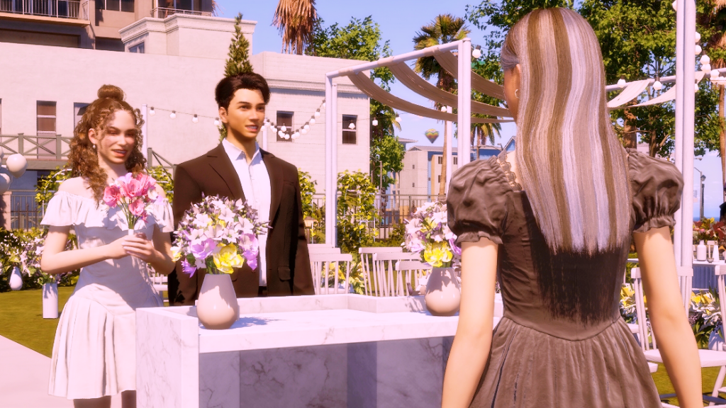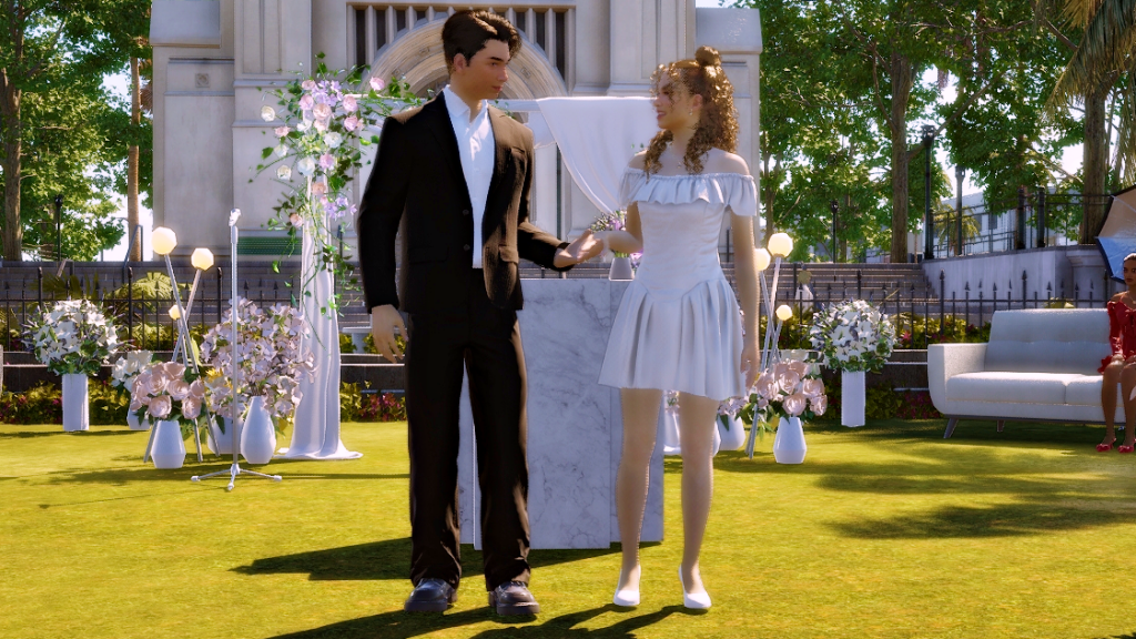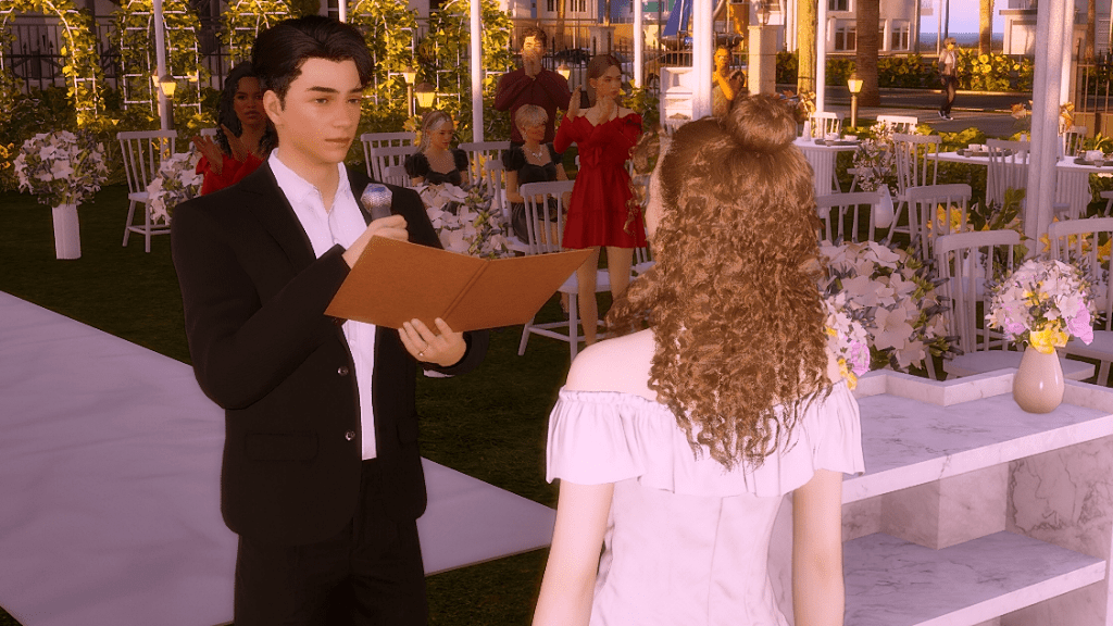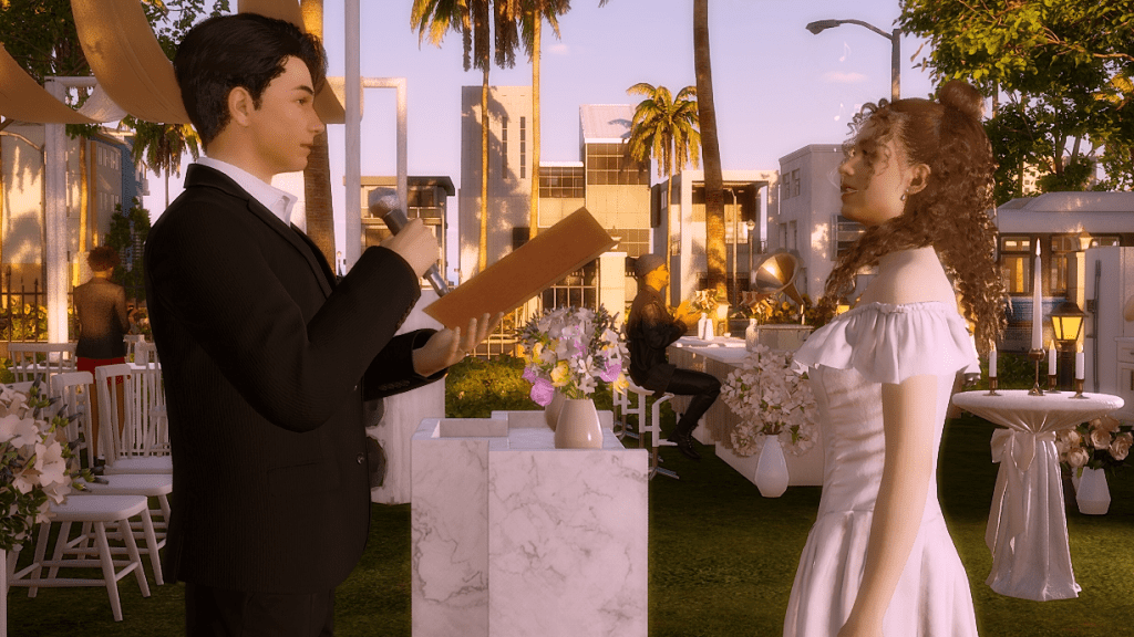 *As a side note, the wedding party went on for hours, and in the end, it turned into a real nightmare because both the groom and the guests were hungry and had to pee. In the lot there was no bathroom and no food either, all they served was coffee, which more or less took away the hunger, but obviously, the more coffee they drank, the more they had to pee. LOL. Anyway, after this experience I went and added a portable bathroom to the lot. I hope the food thing happened because the game is in early access state. I imagine they’ll add catering later, because there’s an existing fridge on the lot and also an electronic menu. There were a few other minor issues, for example, the guests never sat down for the ceremony, although they did sit down at the banquet tables, without the banquet of course. But in itself, except for the bathroom and food stuff, the wedding event itself wasn’t too bad. I give it an 8.