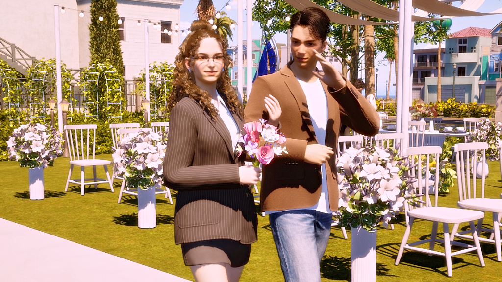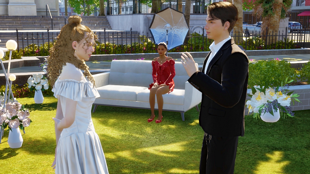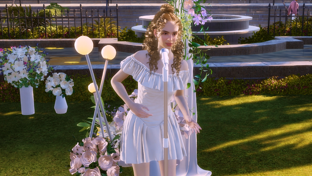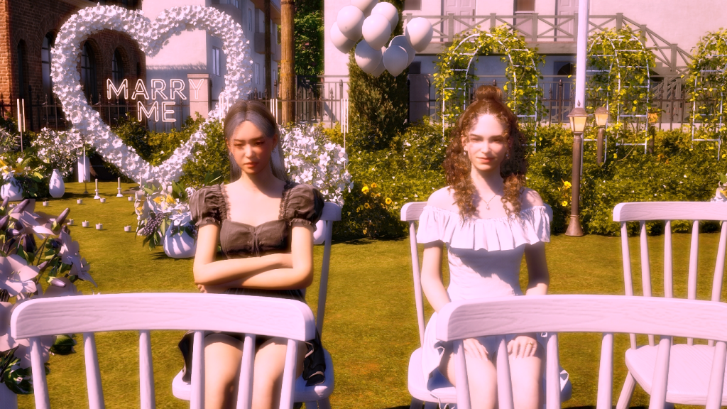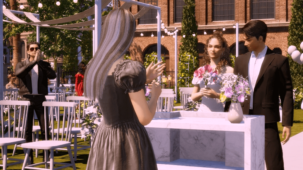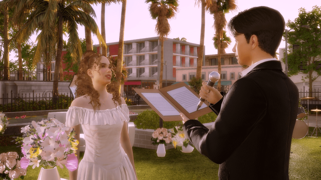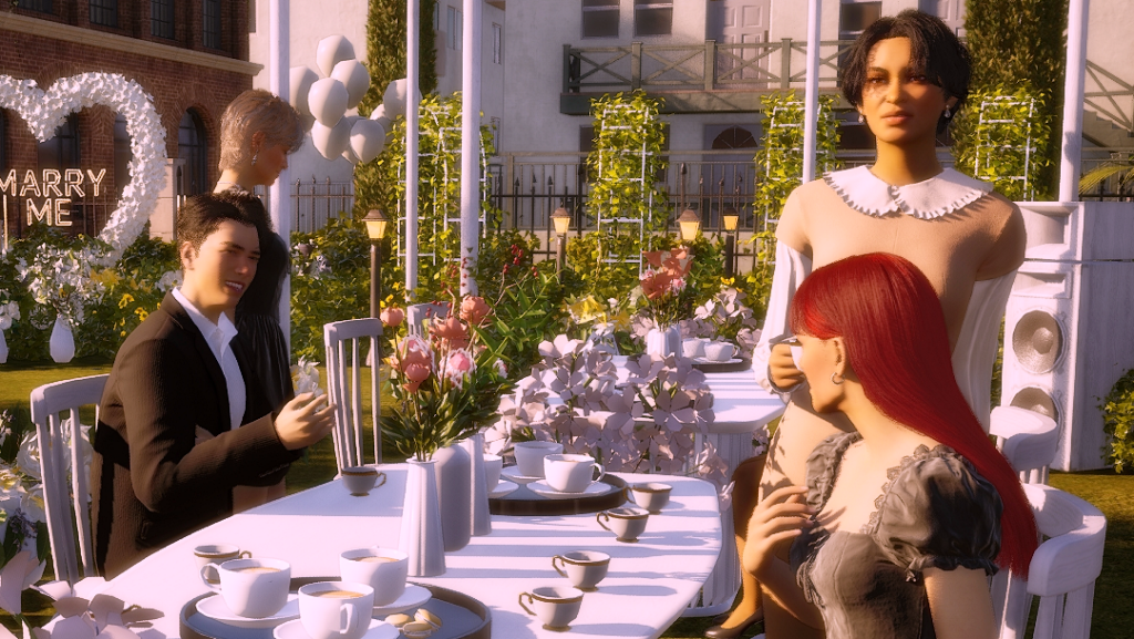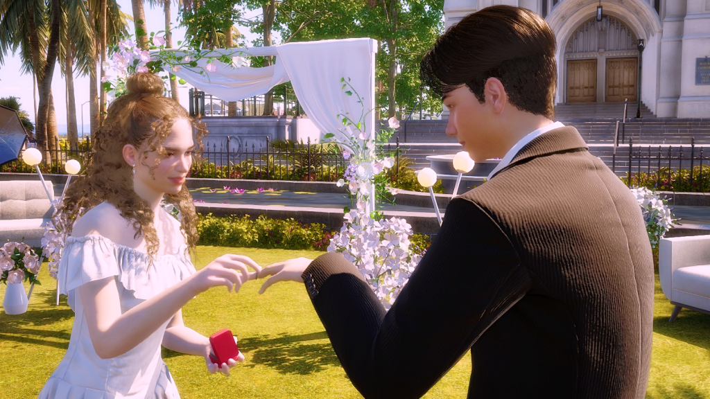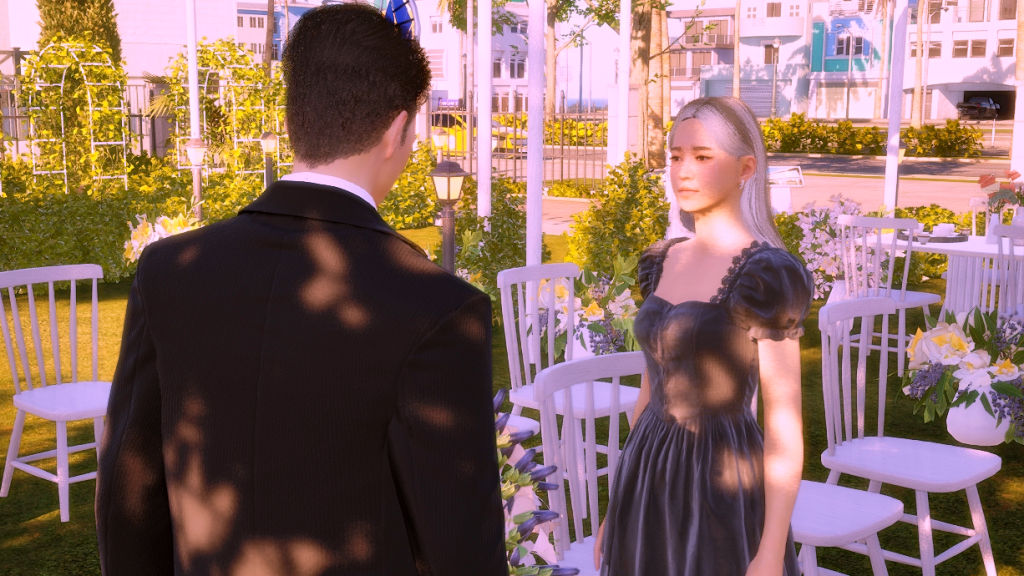 *As a side note, the wedding party went on for hours, and in the end, it turned into a real nightmare because both the groom and the guests were hungry and had to pee. In the lot there was no bathroom and no food either, all they served was coffee, which more or less took away the hunger, but obviously, the more coffee they drank, the more they had to pee. LOL. Anyway, after this experience I went and added a portable bathroom to the lot. I hope the food thing happened because the game is in early access state. I imagine they’ll add catering later, because there’s an existing fridge on the lot and also an electronic menu. There were a few other minor issues, for example, the guests never sat down for the ceremony, although they did sit down at the banquet tables, without the banquet of course. But in itself, except for the bathroom and food stuff, the wedding event itself wasn’t too bad. I give it an 8.