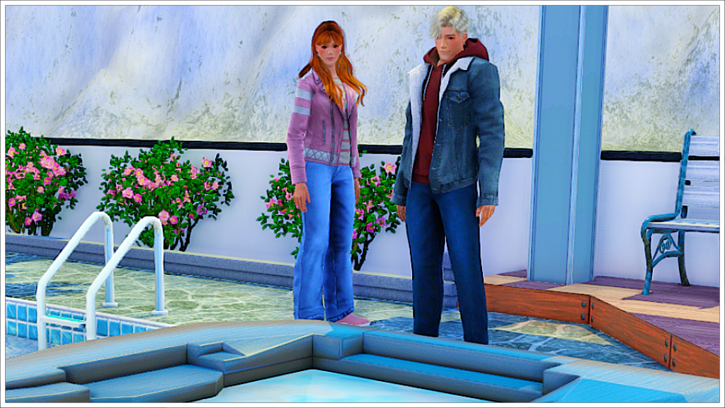 Before entering the house, Katie stopped in front of the hot tub in the garden, located next to the pool.