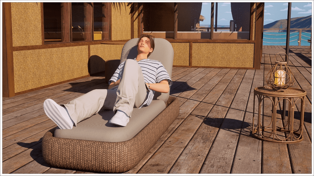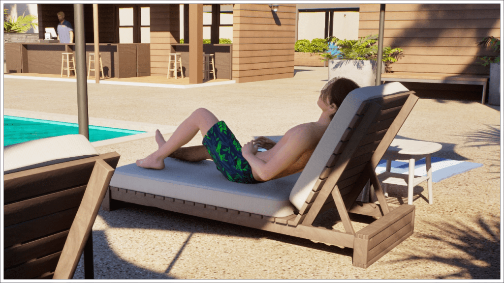 And then a well-deserved nap next to the Private Water Villa, which is quite expensive to rent, so Bradley settles for relaxing outside.