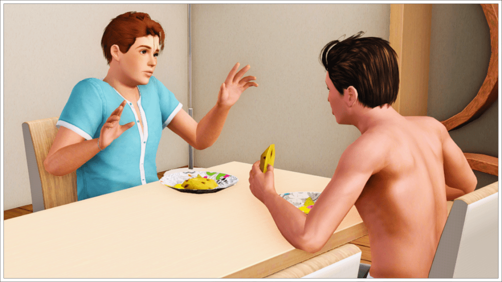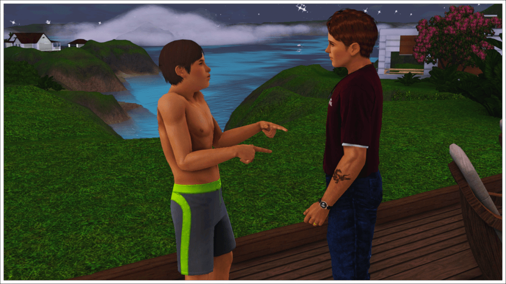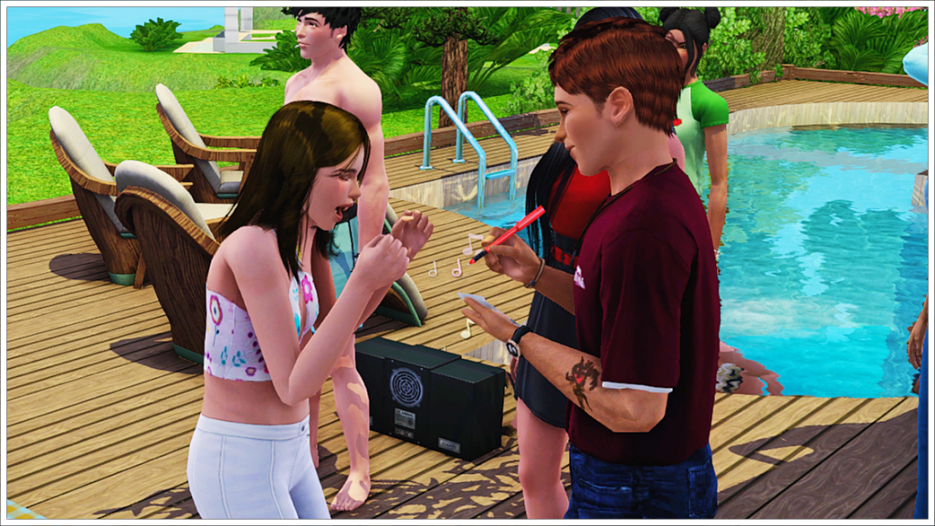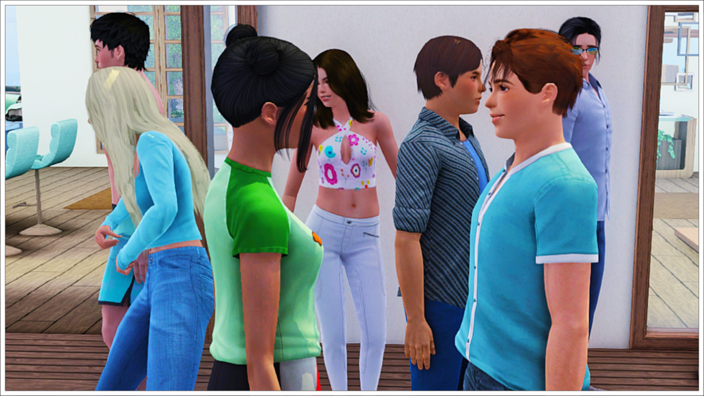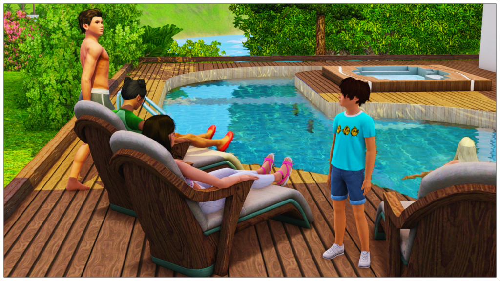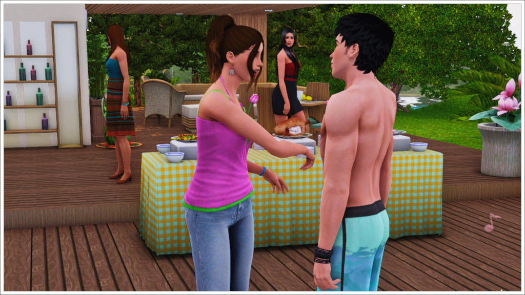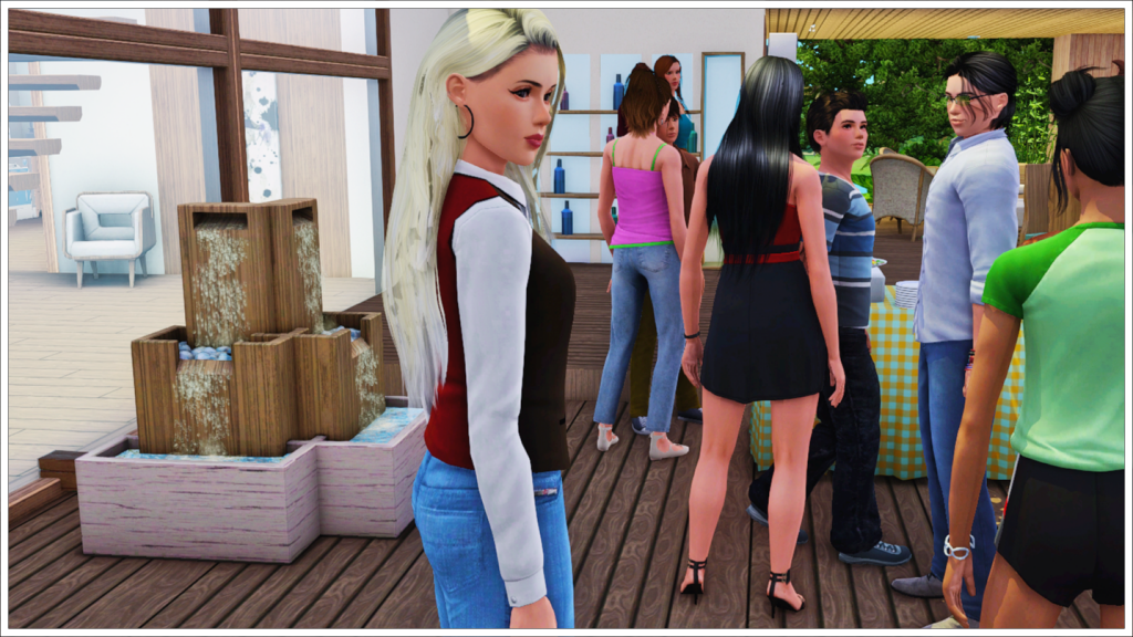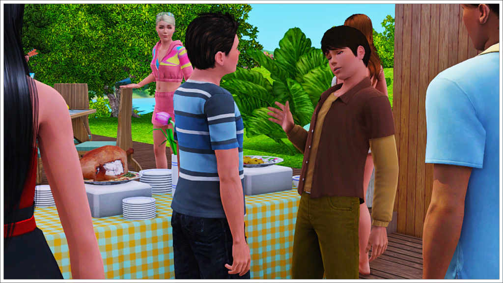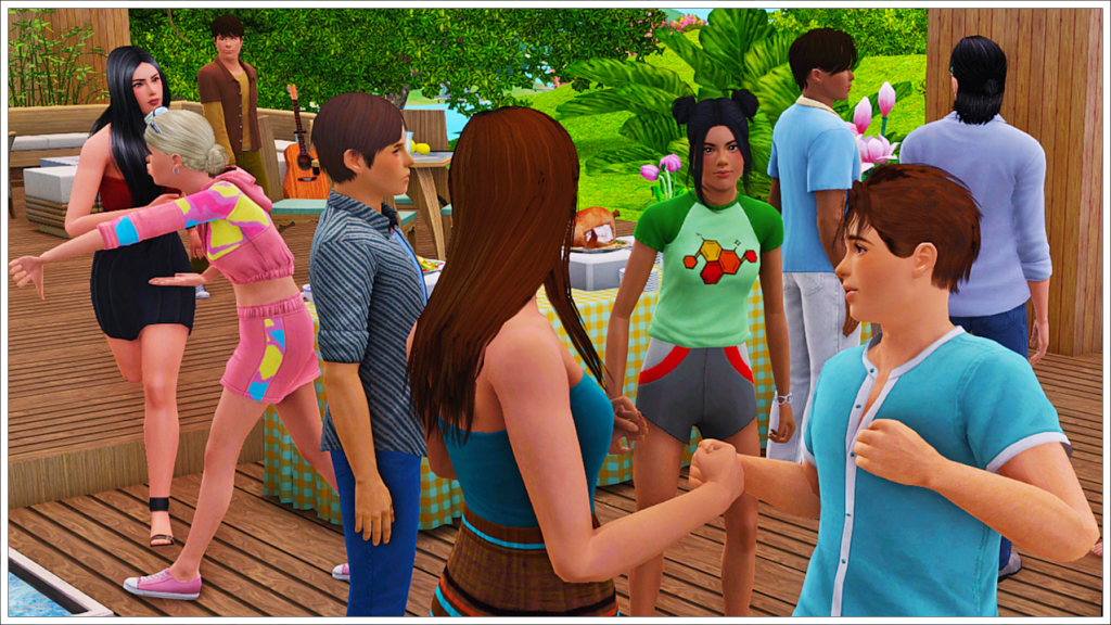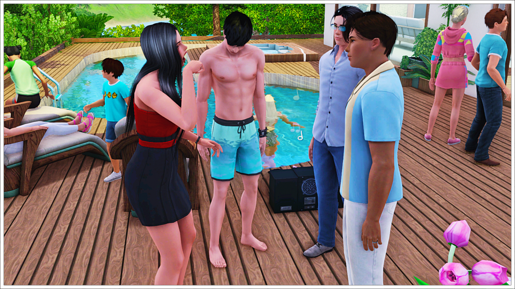 Bradley, Tony’s youngest son with his ex-wife Cassandra, is of course also enjoying the party before leaving for Cahaya (Inzoi town) to enjoy a sabbatical before starting college. As that day approaches, here we see him trying to get along with Peggy Patel, another of his half-siblings’ nannies. In the background, two more of his friends, Meredith Henderson and Phillip Alto.
