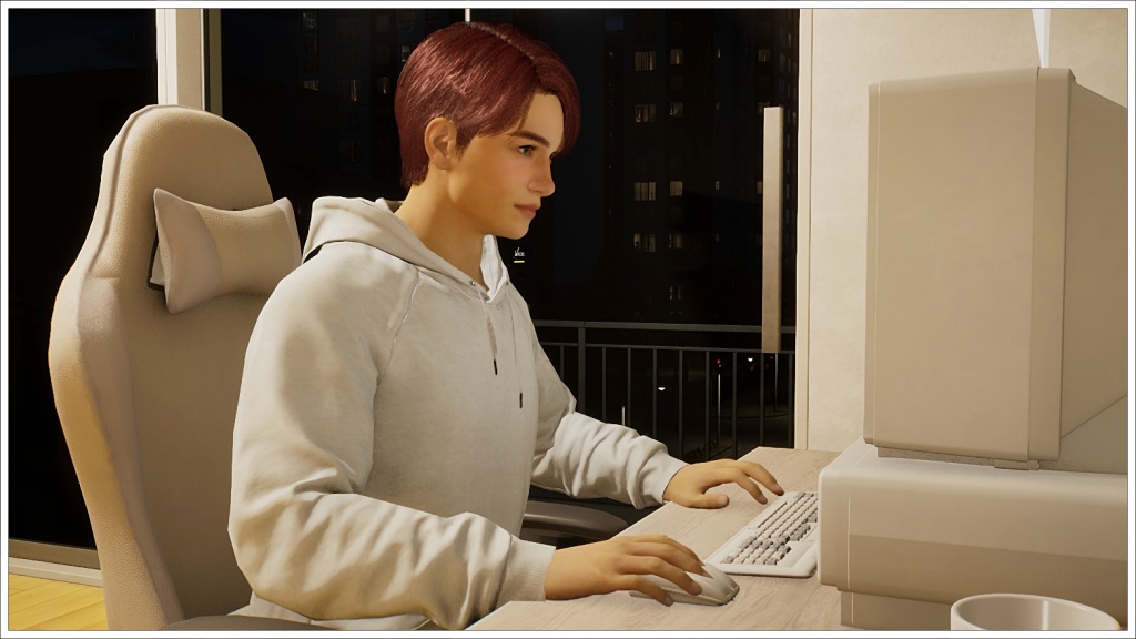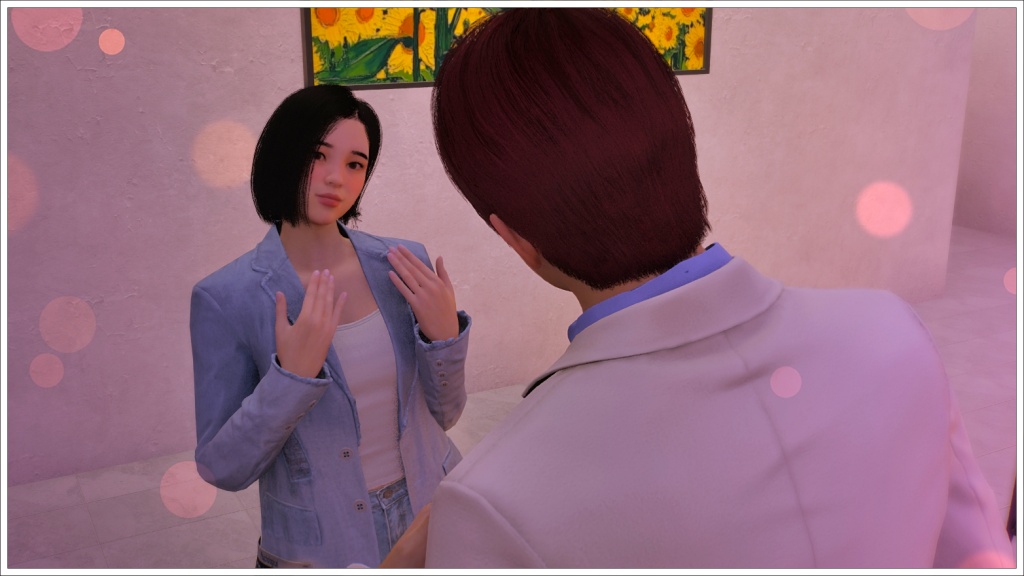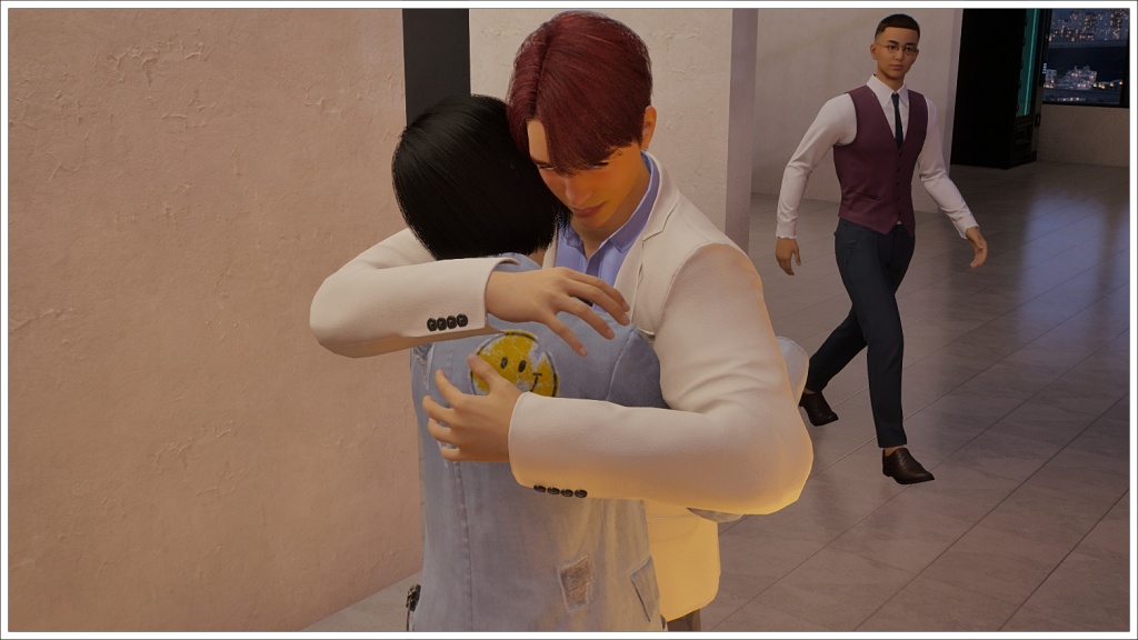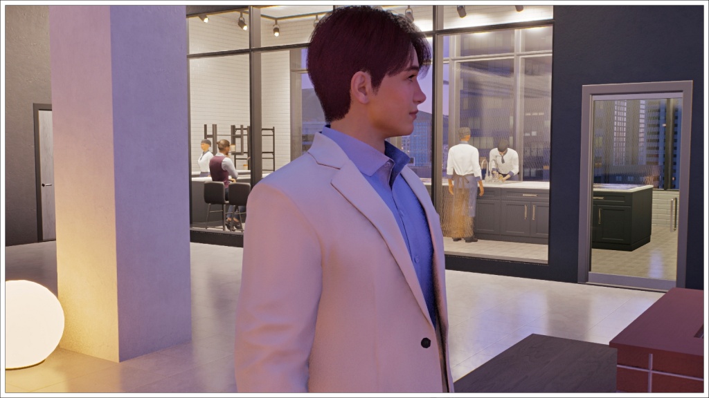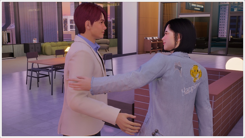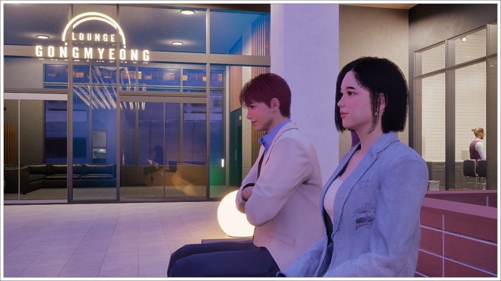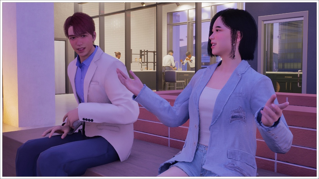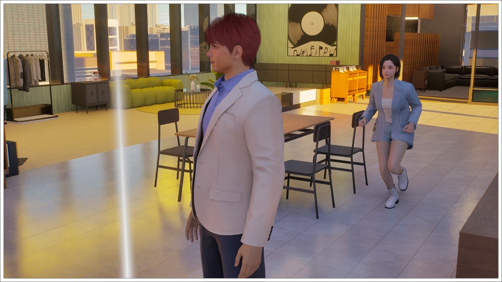 Here comes Bomi. For those who don’t play Inzoi, the white beam in front of Rowan is not a portal to the future, nor is it a teleporter that will take him back to Oasis Landing, but rather the signal used in this game when two zois are going to meet at an agreed location.