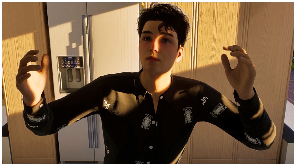 Here are a few other photos of Allan that I took as soon as I put him in the game. I admit Inzoi’s Allan lacks the classic goofiness and cartoonishness of The Sims 4 Allan. But I feel like he is even more alive and emotional as a zoi. Still, and just like with the Cho Brothers, I’ll continue trying to make him closer to the original. I did try to make a middle-aged Allan too, but it didn’t work out too well because he looked too “old” and the character lost some of his natural spark, so I decided to save that for when Allan actually gets old in the story, if we ever get there, that is.