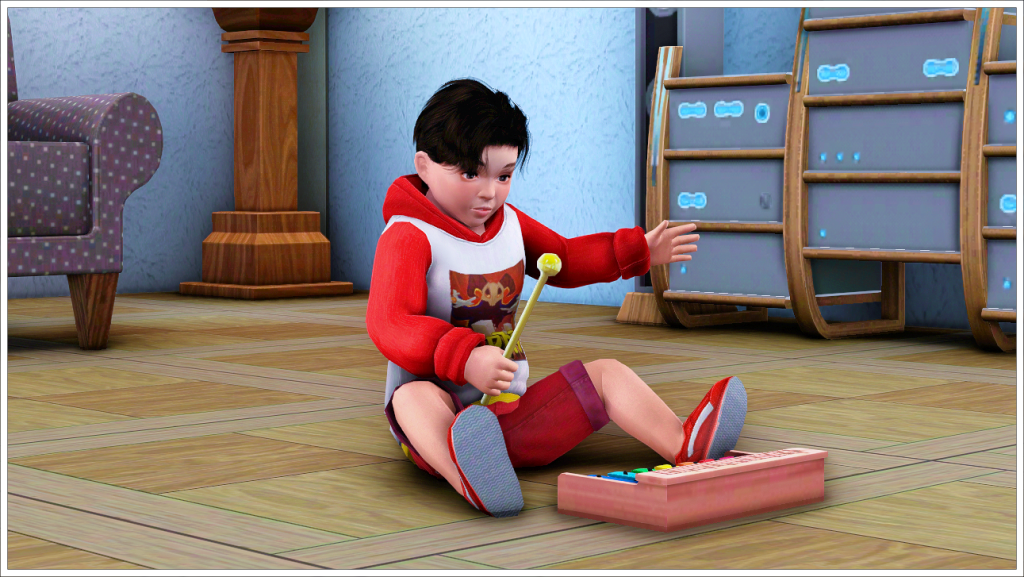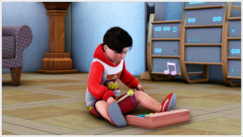 Meanwhile, in the adjoining living room, little Ryan discovers music.