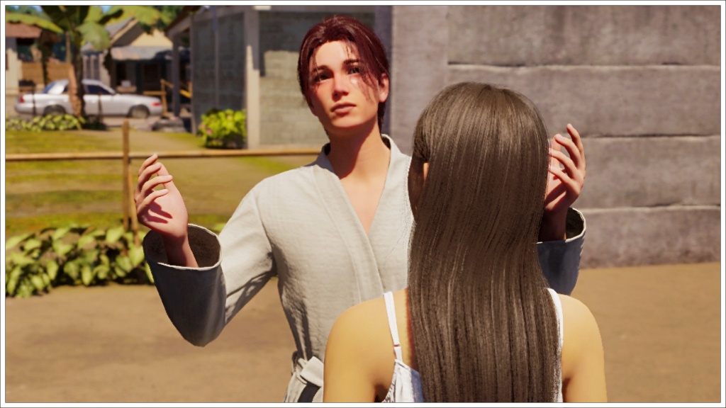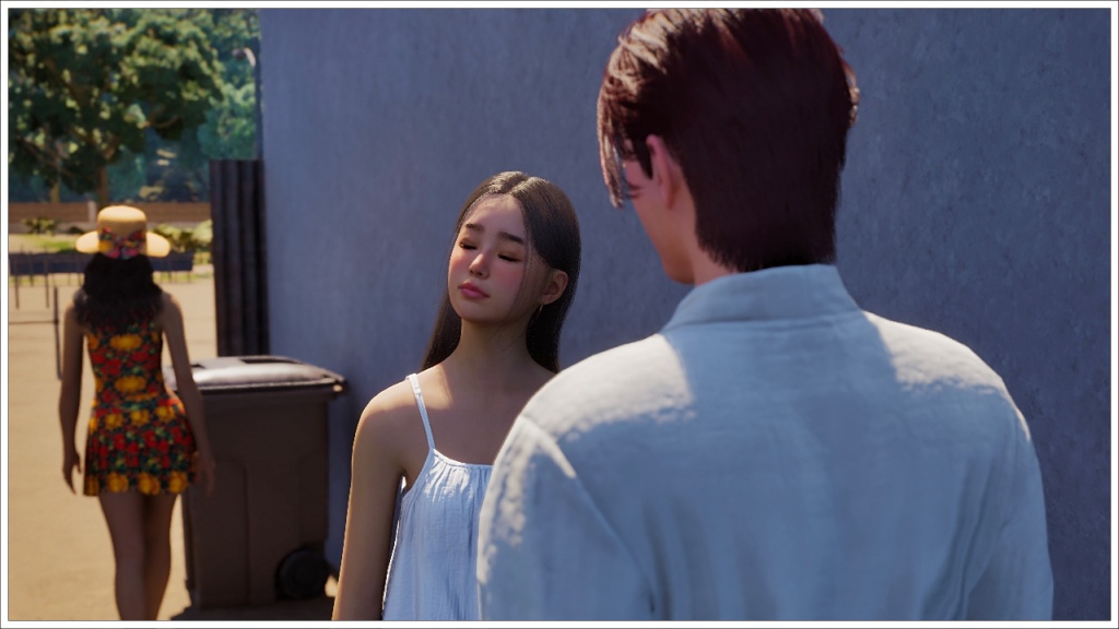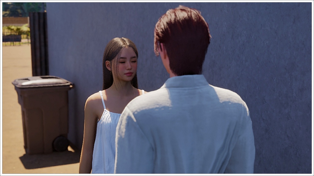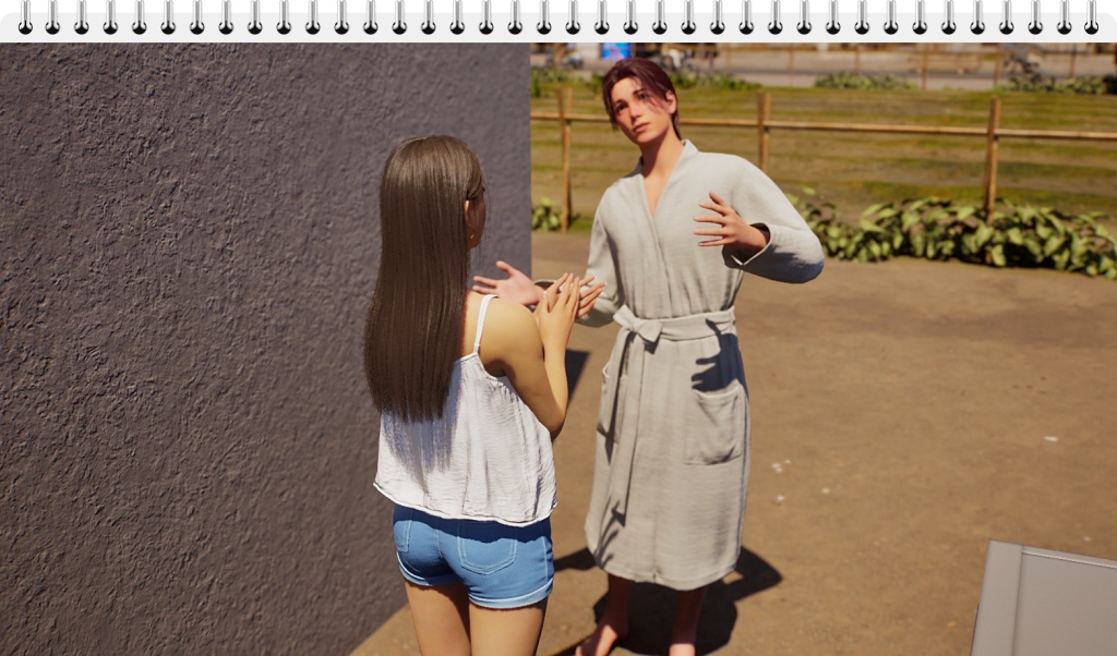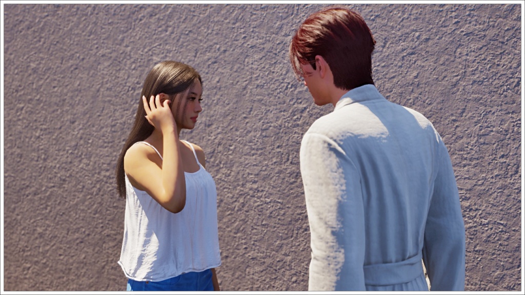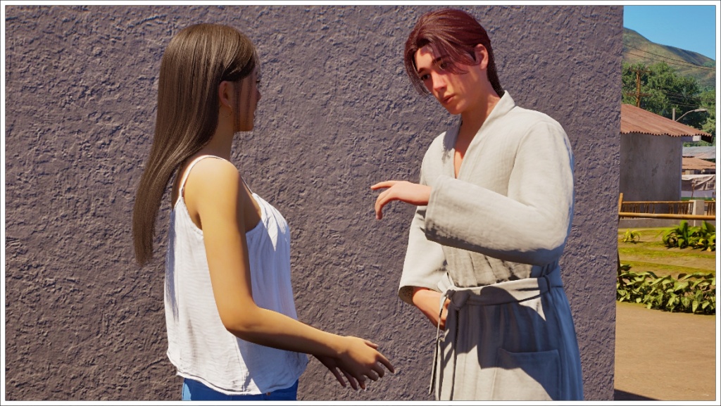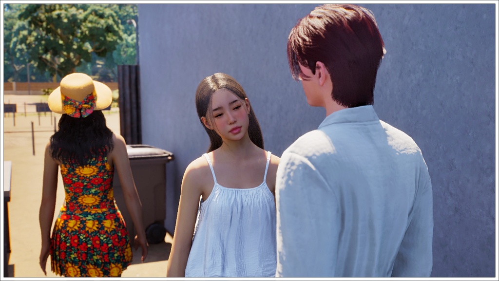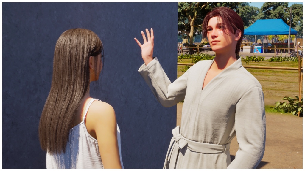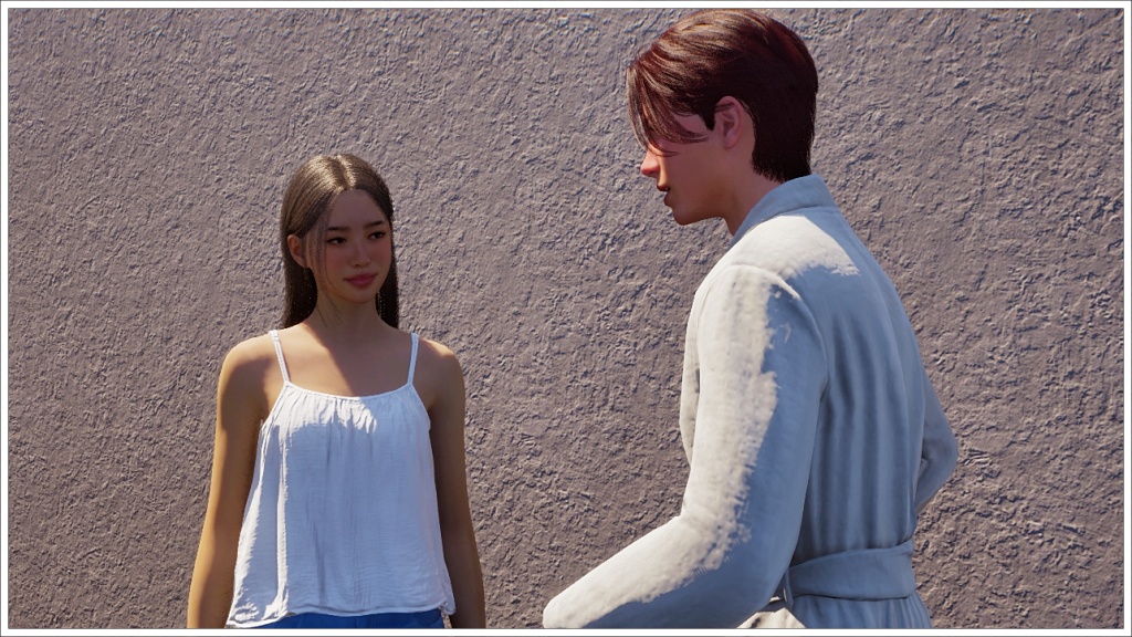 In this scene, Bradley arrived at Gyu-ri’s house wearing the robe, I’m usually very careful about what my characters in my stories wear for each scene, but this isn’t a story as such, it’s just gameplay, which means I don’t prepare the scenes or the poses or the outfits, at least not always. Plus, I didn’t want to interrupt the dialogue to change it, since at that time, at least in my game, it was difficult to get a zoi to show up when another one called him. That’s why I let him keep the robe on throughout the conversation. Allegedly, this bug has already been fixed, but apparently it only works with saves created after the fix, and of course I wasn’t going to start from scratch with this story, which is already quite advanced, so even nowadays (these photos are from November 25), Bradley continues to wear that robe as his default clothing.