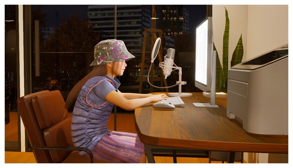 Her computer time is up, so now she’s keeping herself entertained by striking funny poses in the mirror, until her mom calls her from the hallway.